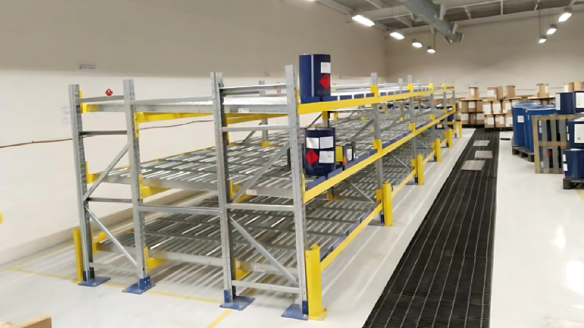 Sistema de almacenamiento que utiliza la gravedad para desplazar las tarimas o productos a lo largo de canales inclinados para permitir el deslizamiento por gravedad (FIFO o LIFO).